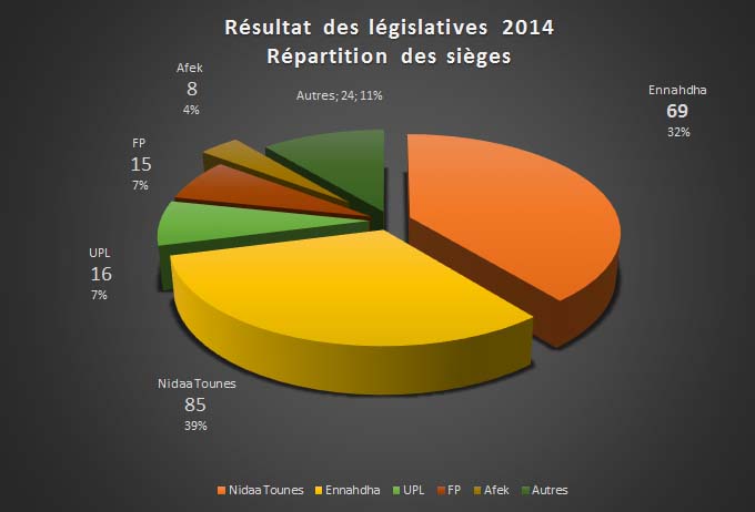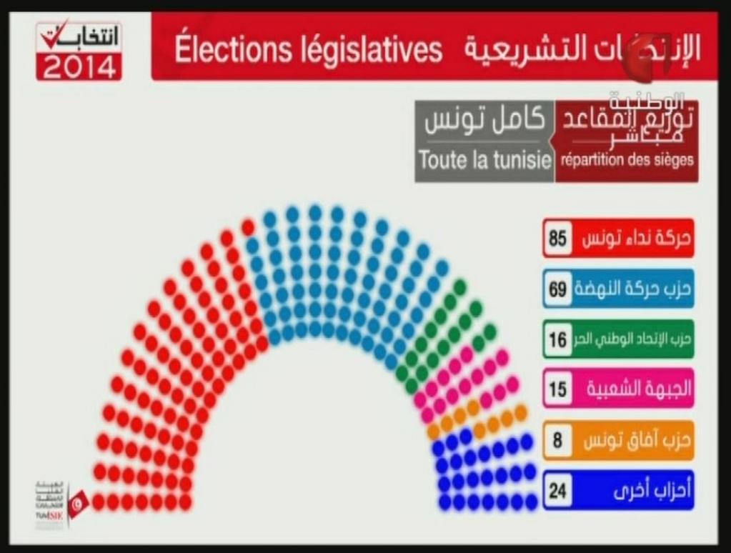 Un peu plus de deux heures du matin, le résultat préliminaire définitif a été annoncé par l’ISIE au média Centre. Comme attendu, Nidaa Tounes arrive en tête avec 85 sièges suivi par Ennahdha avec 69 sièges.