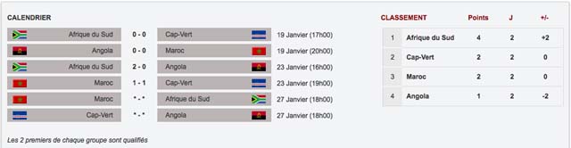 Après deux matchs nuls contre l'Angola (0-0) et le Cap-Vert (1-1), le Maroc (3è du Groupe A) derrière l'Afrique du Sud (4 points) et le Cap-Vert (2 points) est condamné à tout faire pour s'imposer face à l'équipe d'Afrique du Sud.