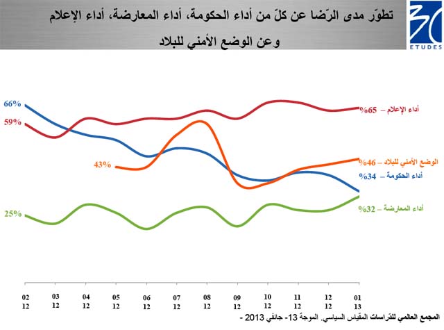 En ce mois de janvier 2013, la satisfaction des Tunisiens quant à la prestation du gouvernement connaît son plus bas depuis le début de notre baromètre avec un taux de 34%, soit 6 points de moins qu’au mois de décembre 2012.