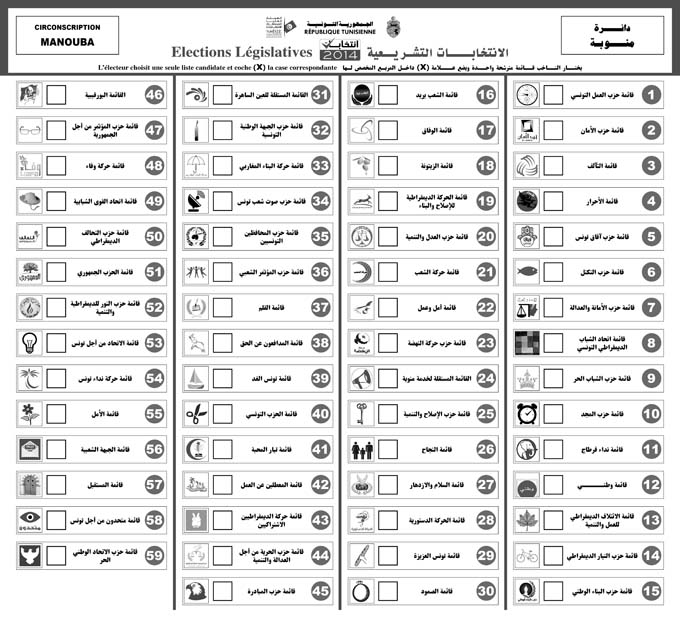 Découvrez votre bulletin de vote, selon votre circonscription : Manouba 25 octobre 2014 Par : Rédaction Le bulletin de vote des listes électorales de la circonscription de Manouba, 59 listes.