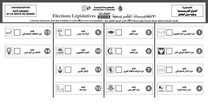 Découvrez votre bulletin de vote, selon votre circonscription : Pays arabes 25 octobre 2014 Par : Rédaction Le bulletin de vote des listes électorales de la circonscription des Pays Arabes, 14 listes.