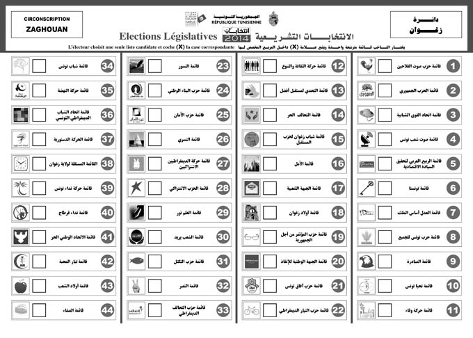 Découvrez votre bulletin de vote, selon votre circonscription : Zaghouan 25 octobre 2014 Par : Rédaction Le bulletin de vote des listes électorales de la circonscription de Zaghouan, 44 listes.