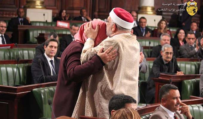 Une photo qui se partage à grande échelle sur les réseaux. Photo de Mbraka Brahmi félicitant Abdelfettah Mourou après son élection au poste de 1er vice-président de l’Assemblée des représentants.