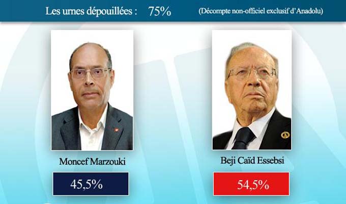 La même agence avait annoncé, après le dépouillement de près de 75% des bulletins de vote, la victoire de Béji Caid Essebsi par 54,5% des voix contre 45,5% des voix pour Moncef Marzouki.