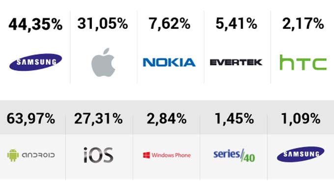 Selon une étude publiée par la société MEDIANET à partir d’un échantillon de plus de 170 sites web tunisiens, ayant réalisé plus de 20 millions de visites au cours de l’année 2014, il apparaît qu’au niveau des visites réalisées à partir d’appareils mobiles, la marque tunisienne EVERTEK arrive en 4ème position avec 5,41% de part de marché juste derrière Nokia (7,6%), Apple (31,05%) et Samsung (44,35%).