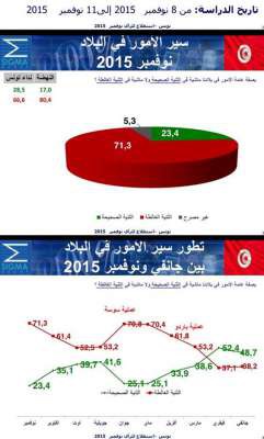 L’évolution du résultat de ce sondage entre janvier et novembre 2015 montre que l’opinion est consciente que le pays va droit dans le mur, avec plus de 71% d’avis négatifs sur la situation du pays, contre seulement 23,4% qui semblent garder un certain optimisme.