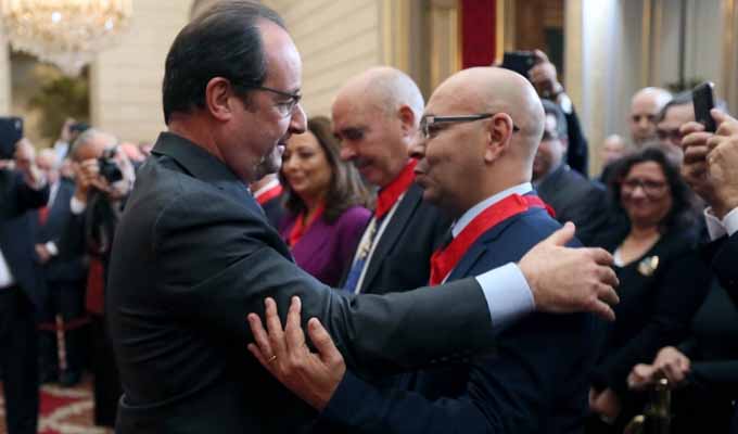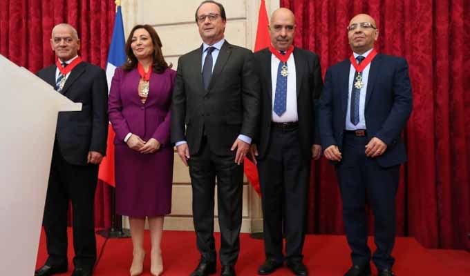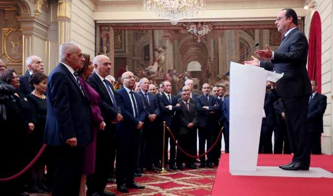 Remise de décorations au Quartet du dialogue national tunisien : Ce qu’a dit Hollande (Vidéo) 8 décembre 2015 Par : Rédaction Le discours de Hollande lors de la remise des décorations (Commandeur de la Légion d’Honneur) aux représentants du Quartet du dialogue national tunisien, Nobel de la paix 2015, au palais de l’Elysée à Paris. Discours lors de la remise de décorations aux… par elysee