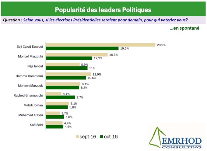 Sur un mois, en septembre et octobre 2016, Béji Caid Essebsi a perdu 9,7 points dans l’indice de popularité, à 19,2% en Octobre contre 28,9 un mois auparavant.