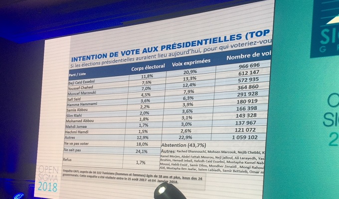 Si des élections présidentielles sont organisés aujourd’hui, Béji Caid Essebsi serait favori pour l’emporter devant Youssef Chahed et le challenger des premières élections Moncef Marzouki, affirme Hassan Zargouni lors d’une présentation à l’open sigma, samedi 20 janvier.