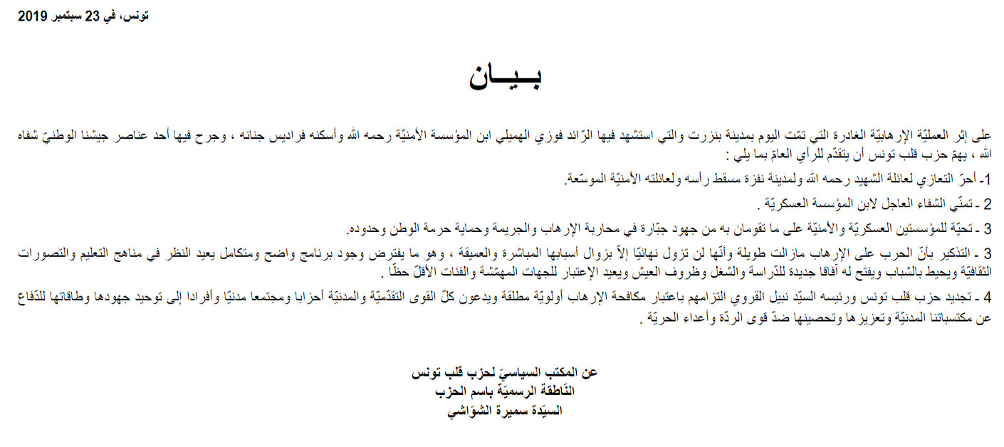 Dans un communiqué, le parti Qalb Tounes a tenu à présenter ses condoléances à la famille de Faouzi Houimli, le sécuritaire tué par un extrémiste alors qu’il se rendait à son travail.