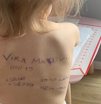 : Elle inscrit les coordonnées de sa fille sur son dos